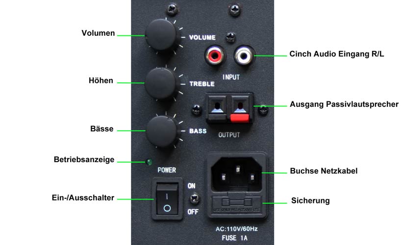 Der Satz setzt sich zusammen aus einem Aktiv-Lautsprecher und einem Passiv-Lautsprecher, die sich überdas mitgelieferte Lautsprecherkabel untereinander verbinden lassen. Der Aktiv-Lautsprecher ist mit einem leistungsfähigen Stereo-Verstärker ausgestattet. Es lässt sich direkt eine Audioquelle über ein Cinchkabel anschließen.