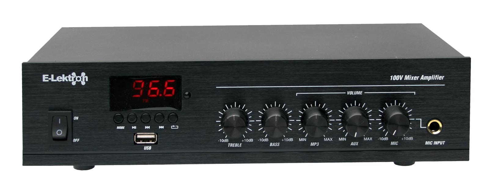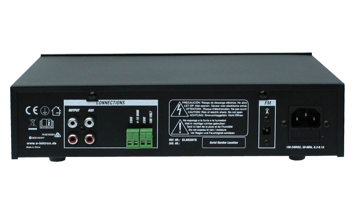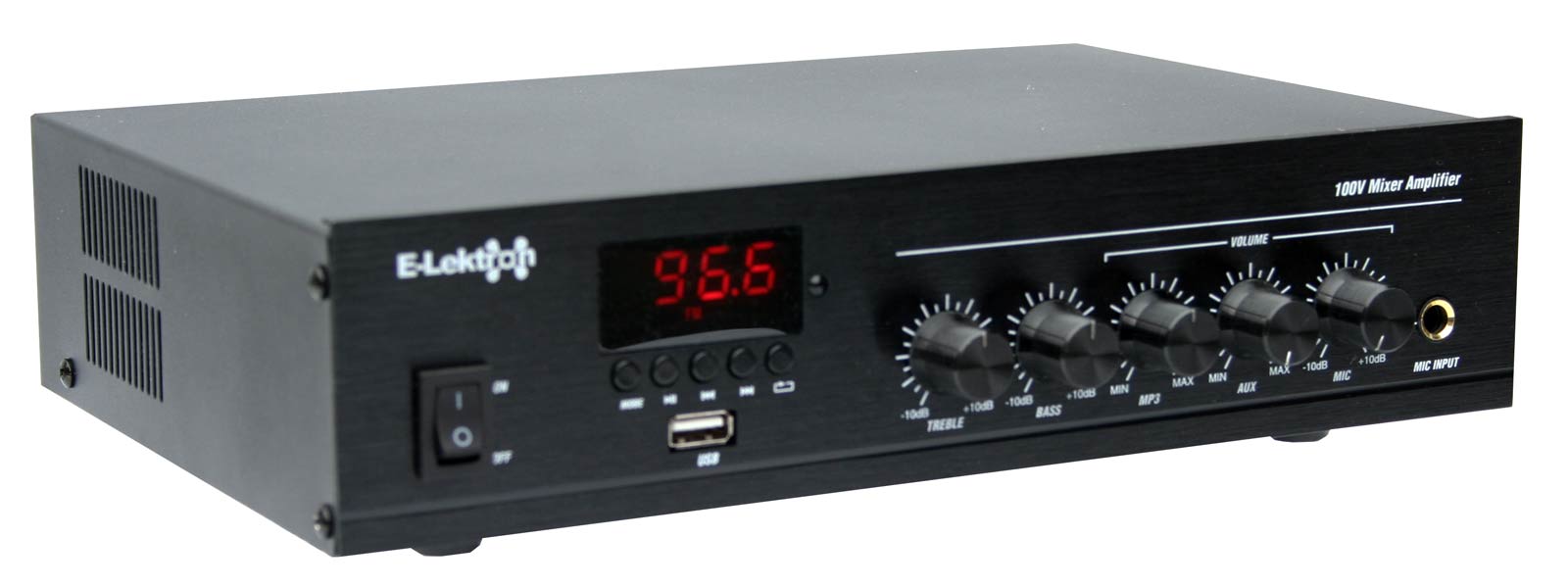 Der Misch-Verstärker ist ausgestattet mit einem Musik-Player (USB, Bluetooth und FM-Radio) und hat eine Buchse zum Anschluss von einem Mikrofon für Ansagen. Rückseitig gibt es einen AUX-Eingang zum Anschluss weiterer Musikquellen. Die Lautstärken der Sound-Quellen lassen sich einzeln regeln und mischen.