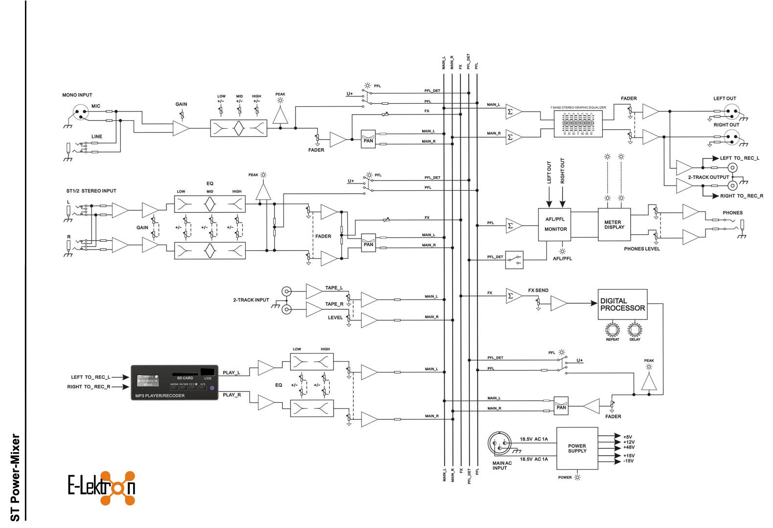 - Live-Mischpult mit 4 Mikrofon- oder Instrument-Kanäle, 2 Stereo-Kanäle, Stereo Media-Player Kanal und Stereo CD/TAPE Anschluss und integrierter 2x 250 Watt Endstufe